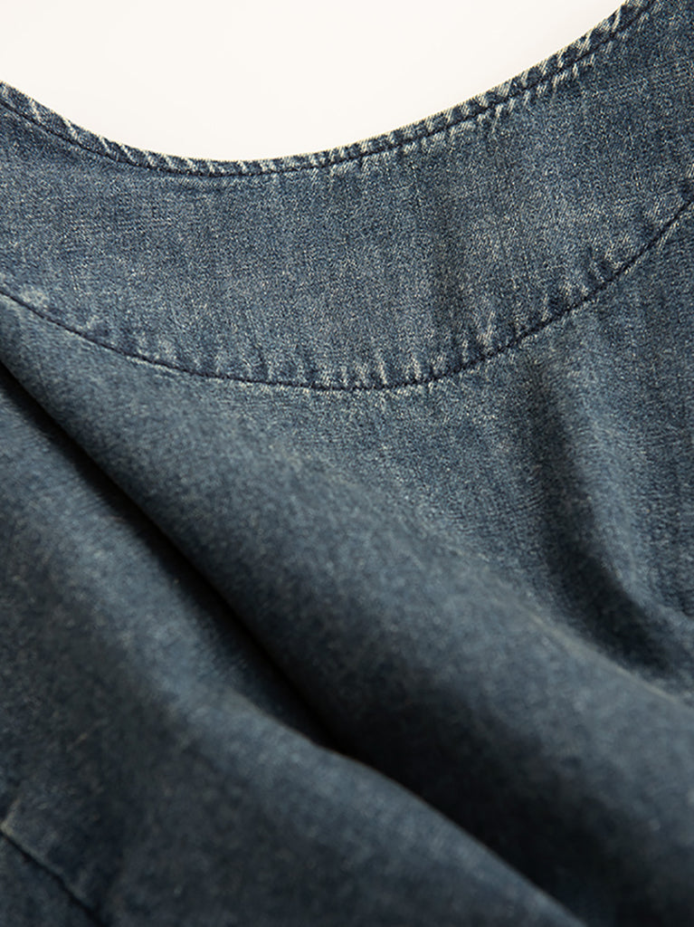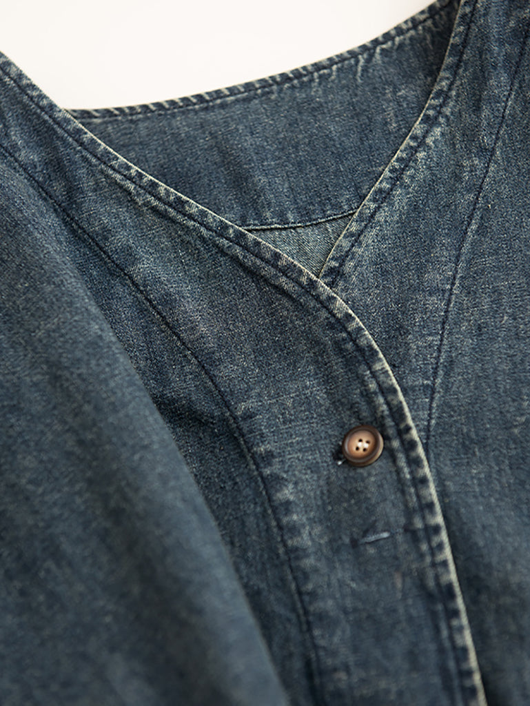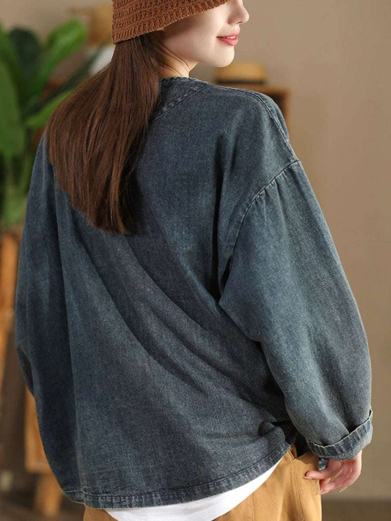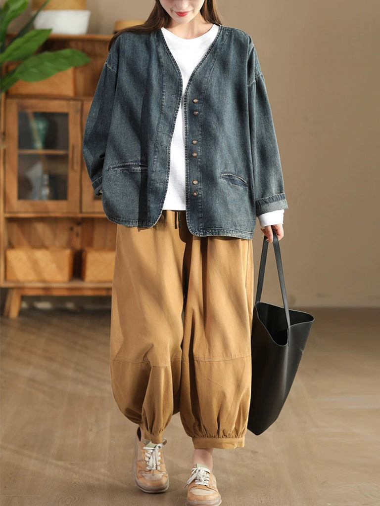 Ženska vintage jesenska traper jakna s V-izrezom u čistoj boji