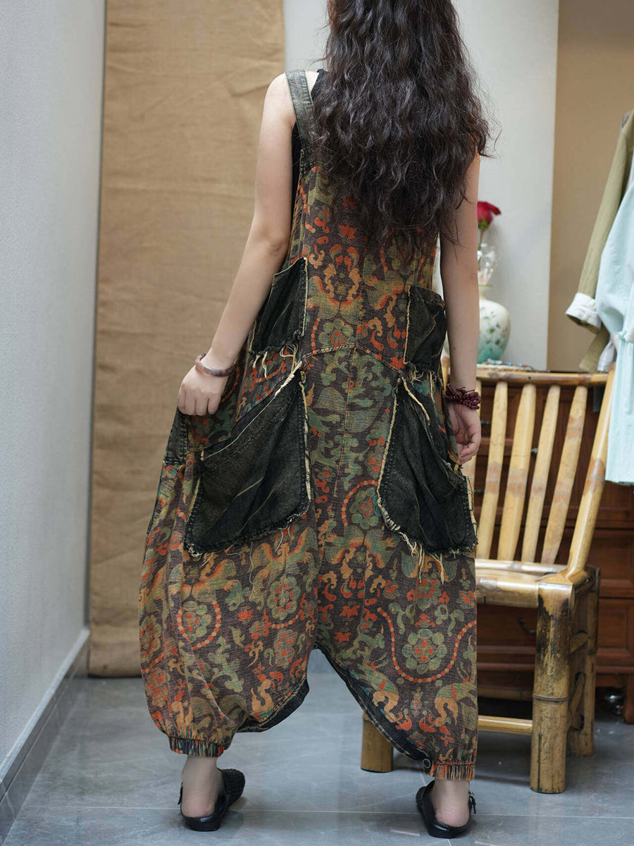 Ženski vintage cvjetni traper kombinezon s niskim međunožjem