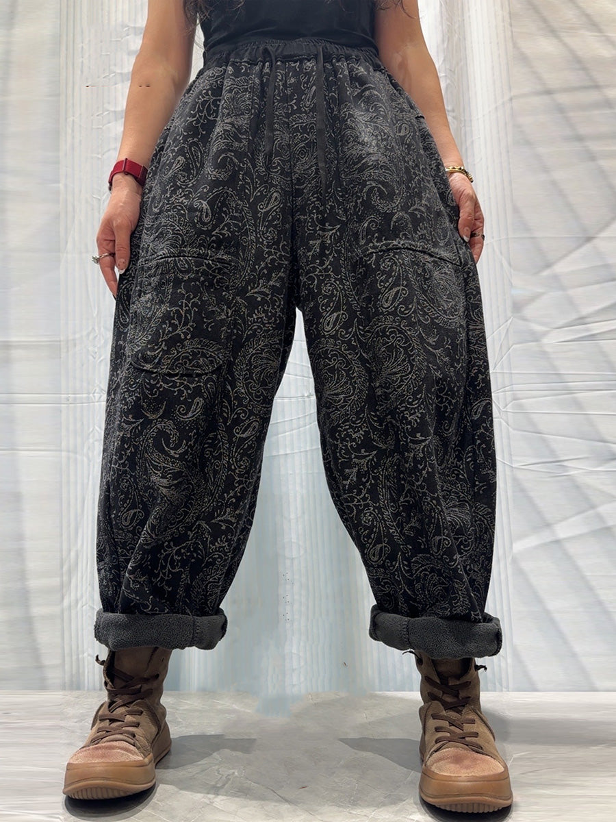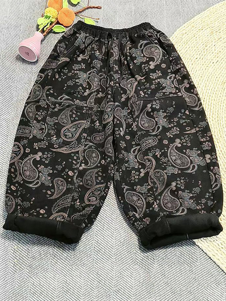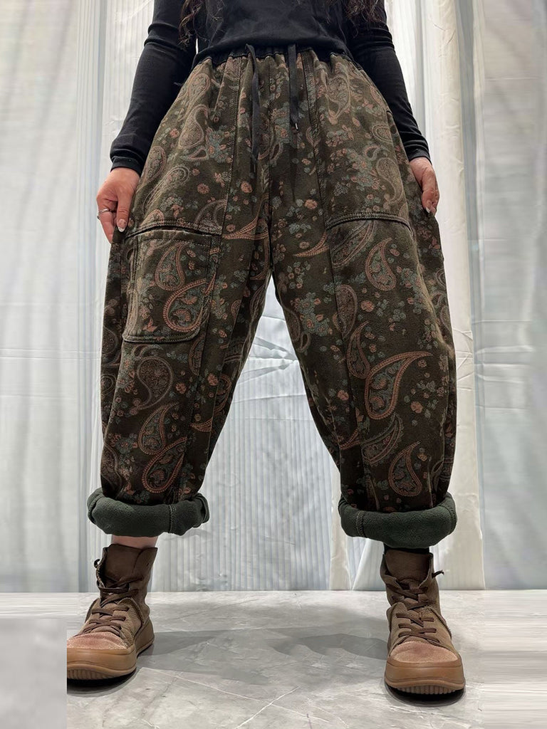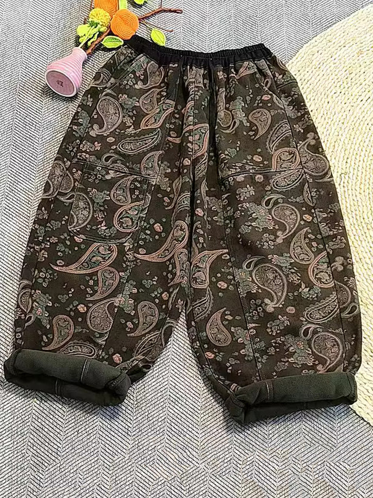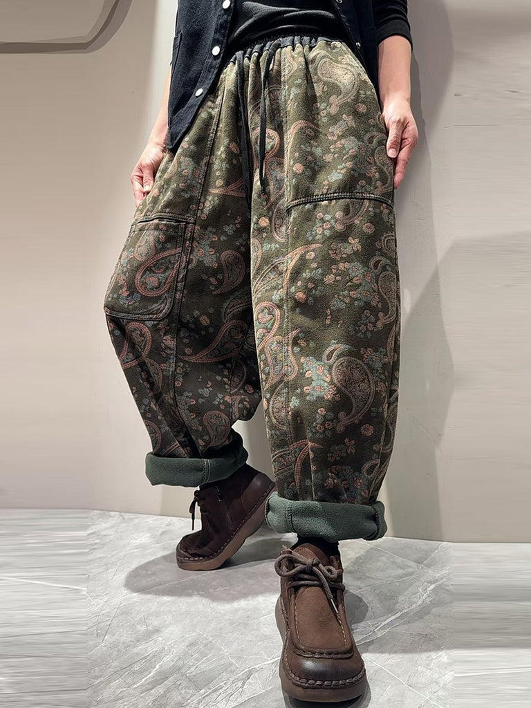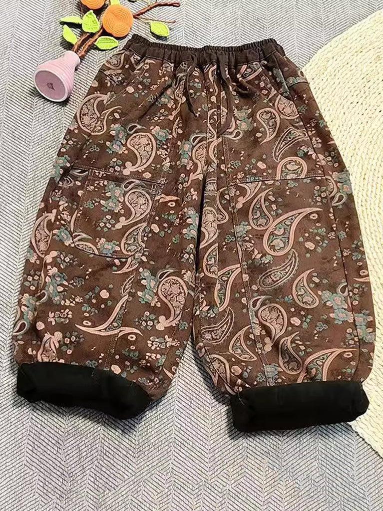 Ženske vintage harem hlače s cvjetnim uzorkom i flis podstavom