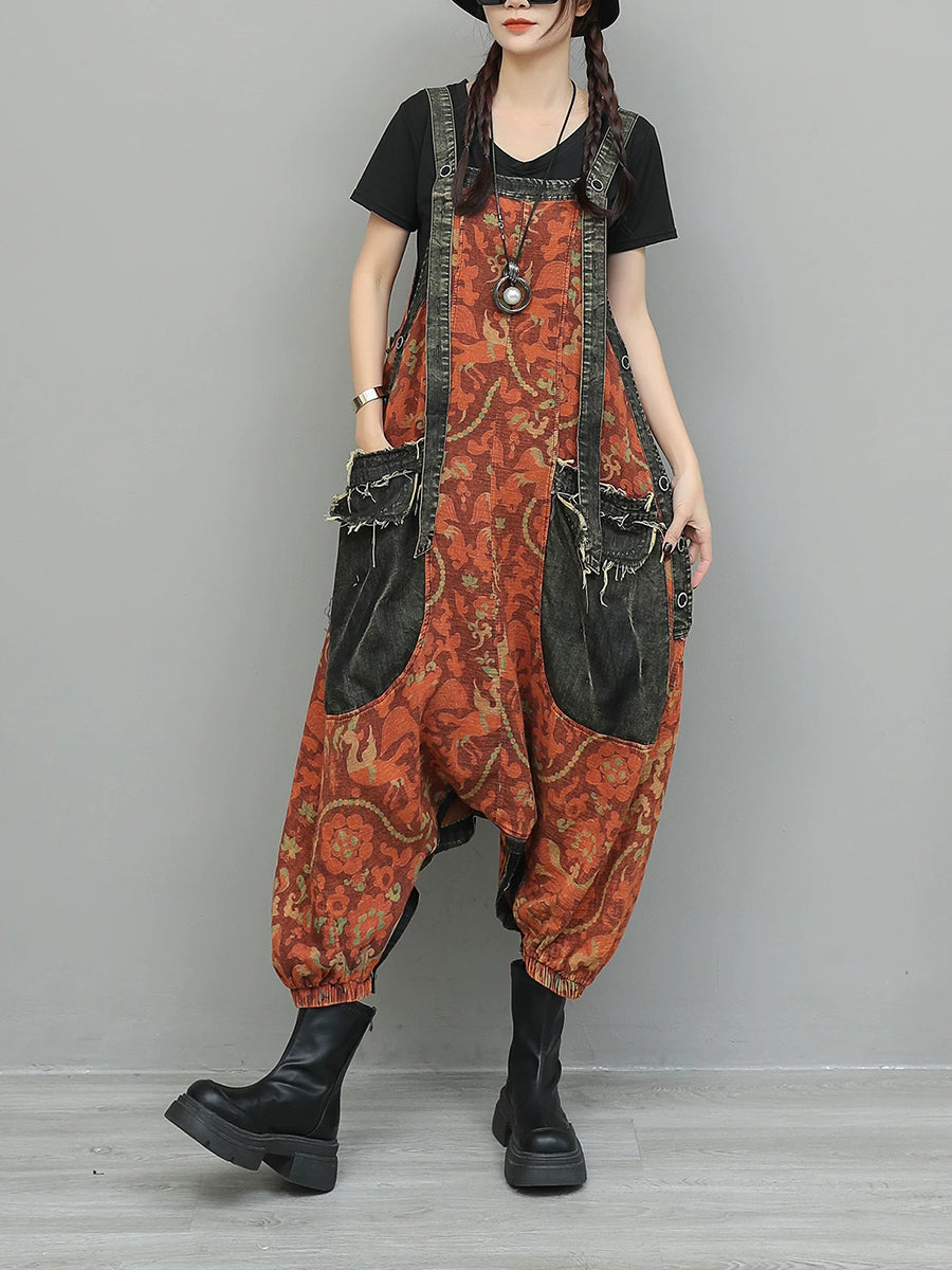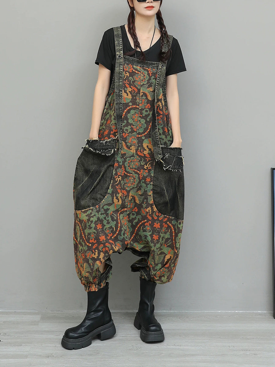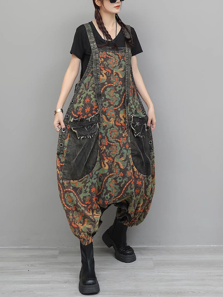 Ženski vintage traper kombinezoni s cvjetnim uzorkom