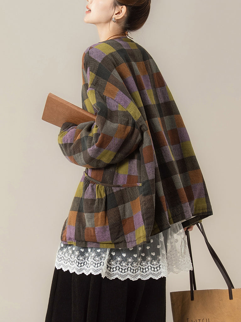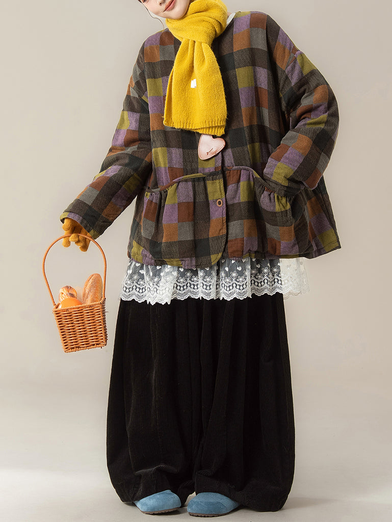 Izrađen za zahtjevne ljubitelje vintage odjeće, ovaj zimski esencijalni komad odlikuje se bezvremenskim kariranim uzorkom uparenim s klasičnom siluetom s O-izrezom. Raglan rukavi pružaju poboljšanu pokretljivost i udobnost, dok kroj pune duljine osigurava potpunu toplinu tijekom jesenskih i zimskih mjeseci. Profinjena retro estetika čini ovaj podstavljeni kaput svestranim slojevitim komadom koji premošćuje sezonske prijelaze s decentnom sofisticiranošću.