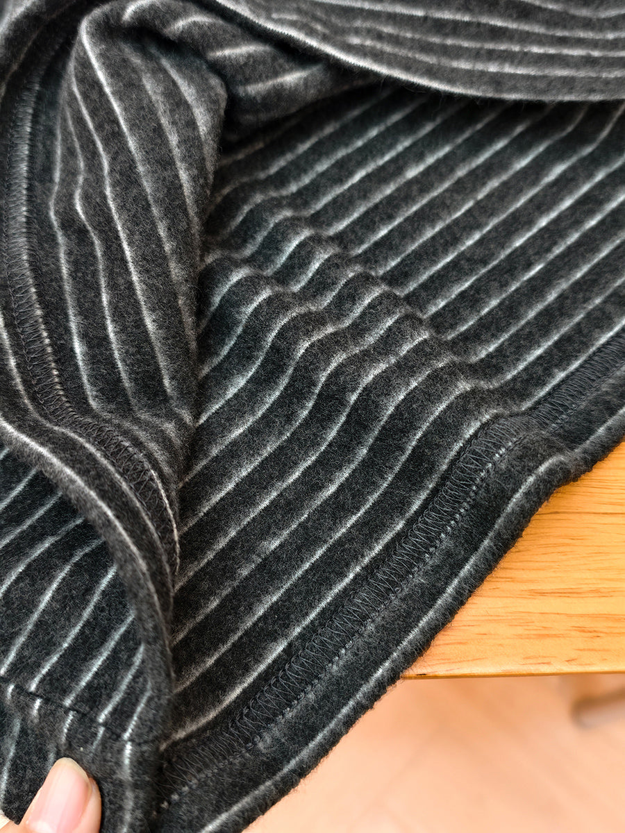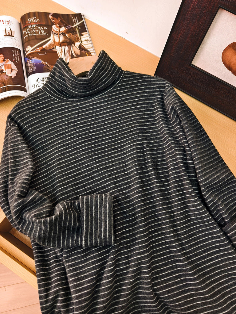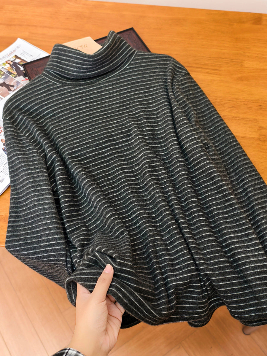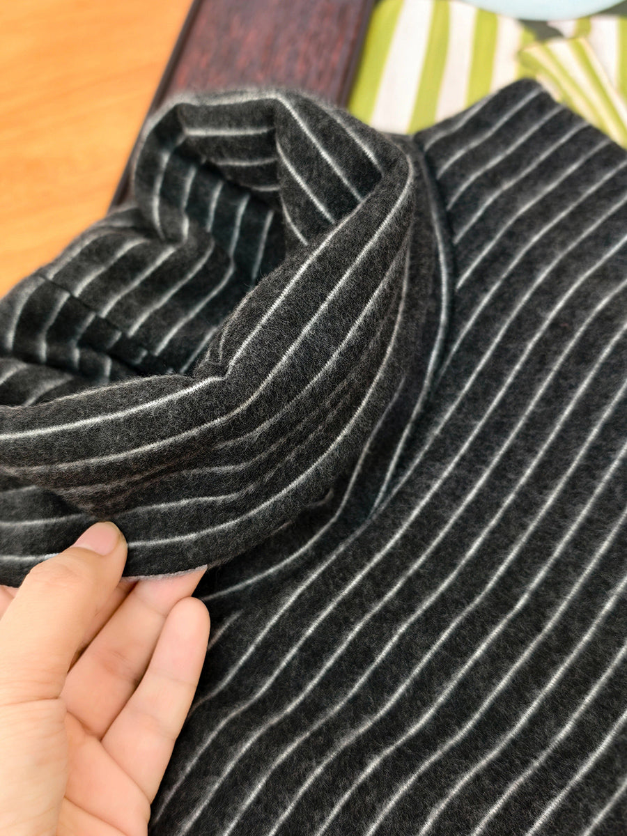 Izrađen od vrhunske mješavine 62,5% pamuka, 33,5% poliestera i 4% spandexa, ovaj zimski neophodan komad pruža udobnost i izdržljivost. Klasični prugasti uzorak besprijekorno se slaže s profinjenim ovratnikom s dolčevitom, dok dugi rukavi pružaju potpunu pokrivenost. Dizajniran s opuštenom ležernom estetikom, lako se prelazi iz jeseni u zimu, što ga čini svestranim dodatkom svakoj sezonskoj garderobi.