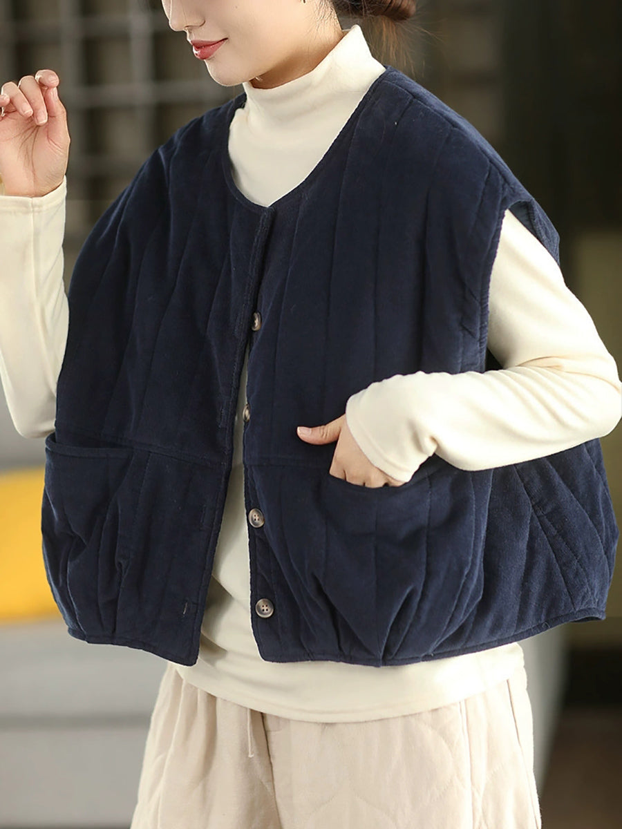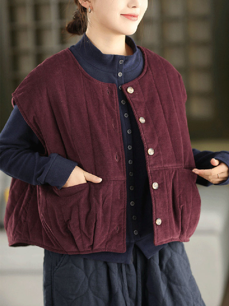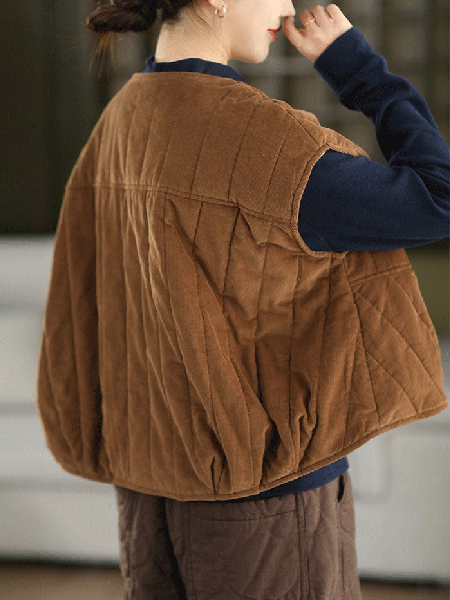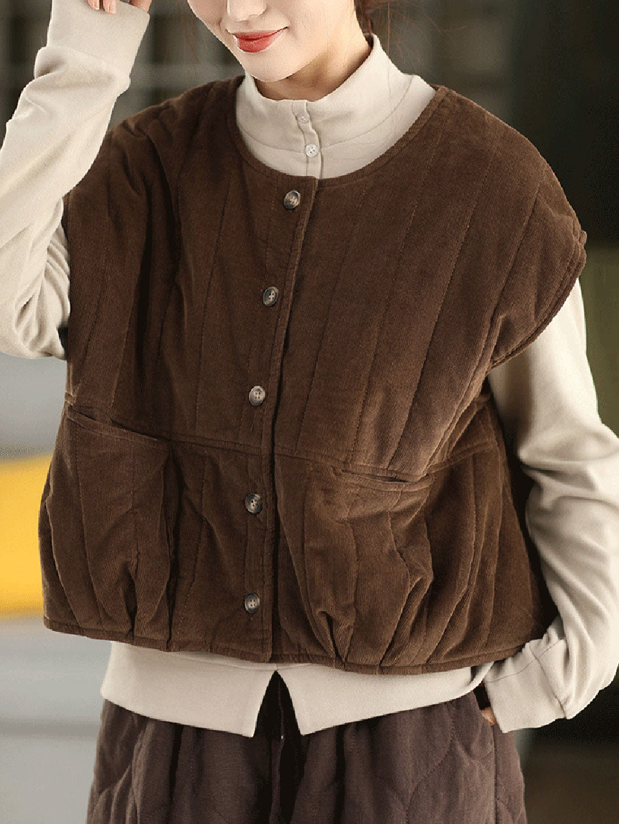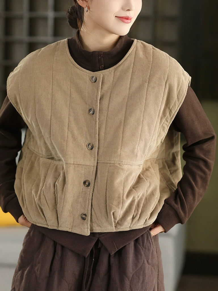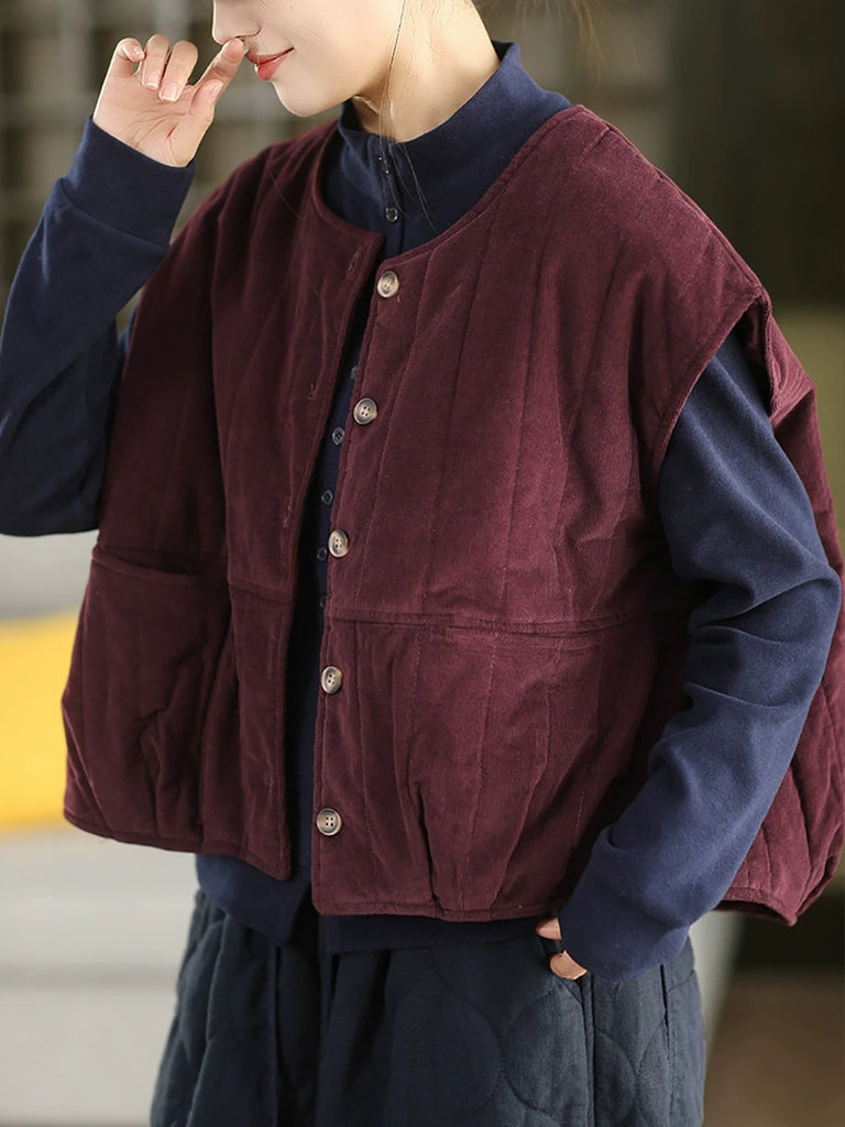 Ženski zimski podstavljeni kordurojni prsluk s O-izrezom u čistoj boji