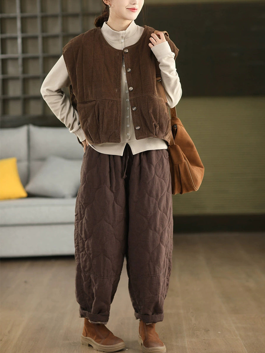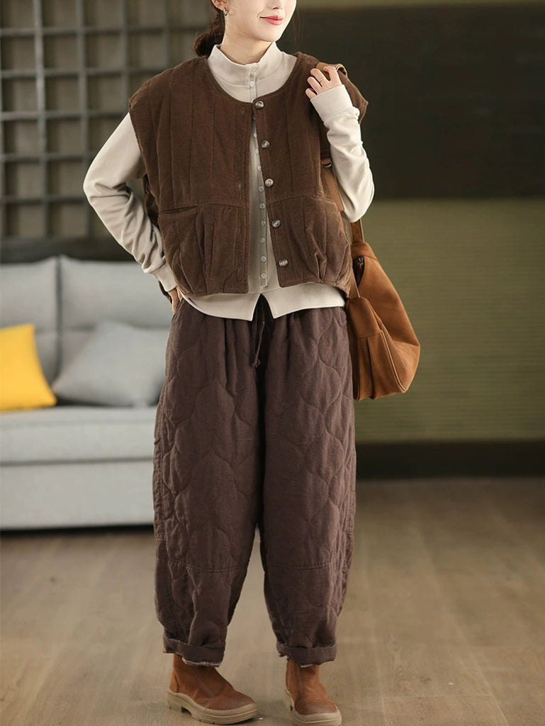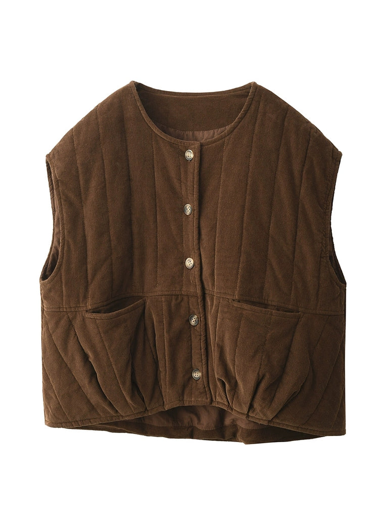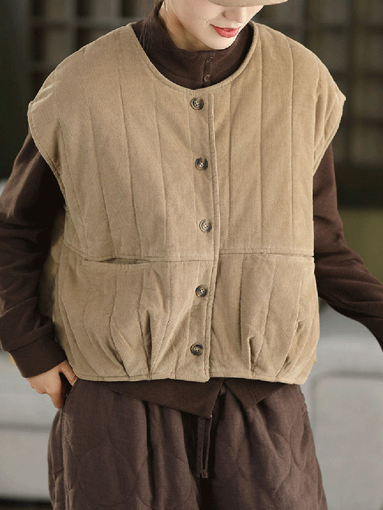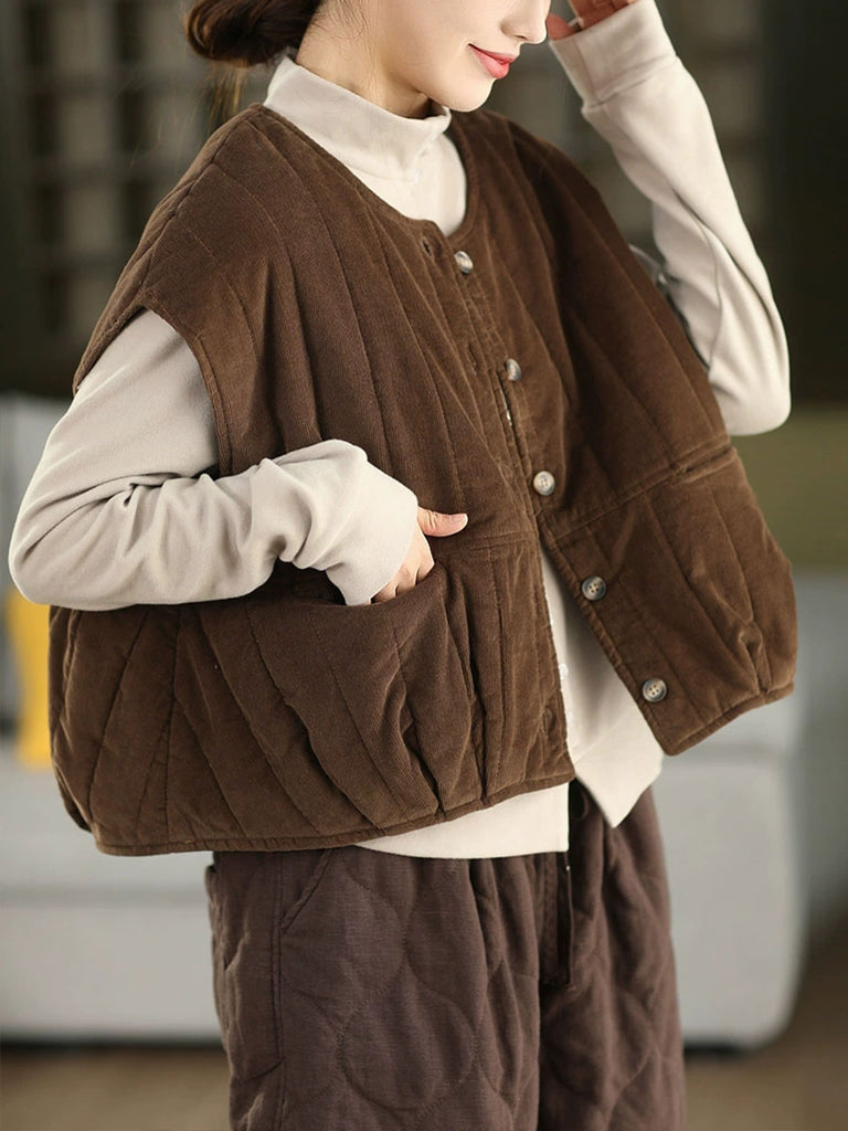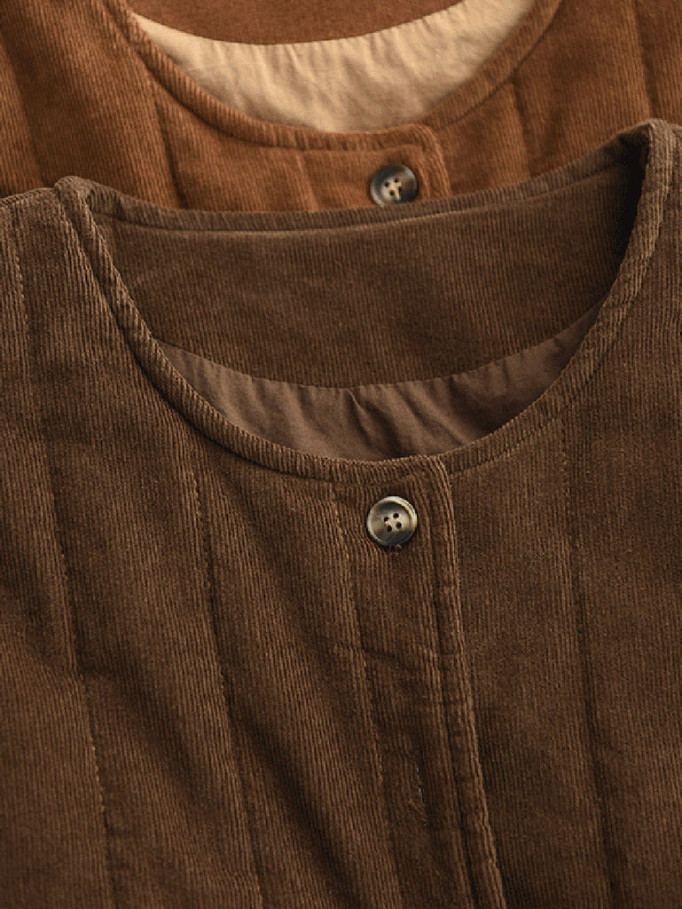 Ženski zimski podstavljeni kordurojni prsluk s O-izrezom u čistoj boji