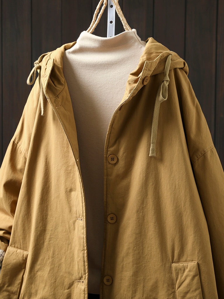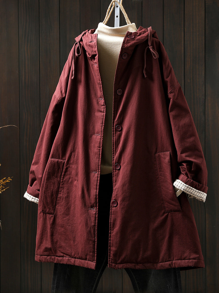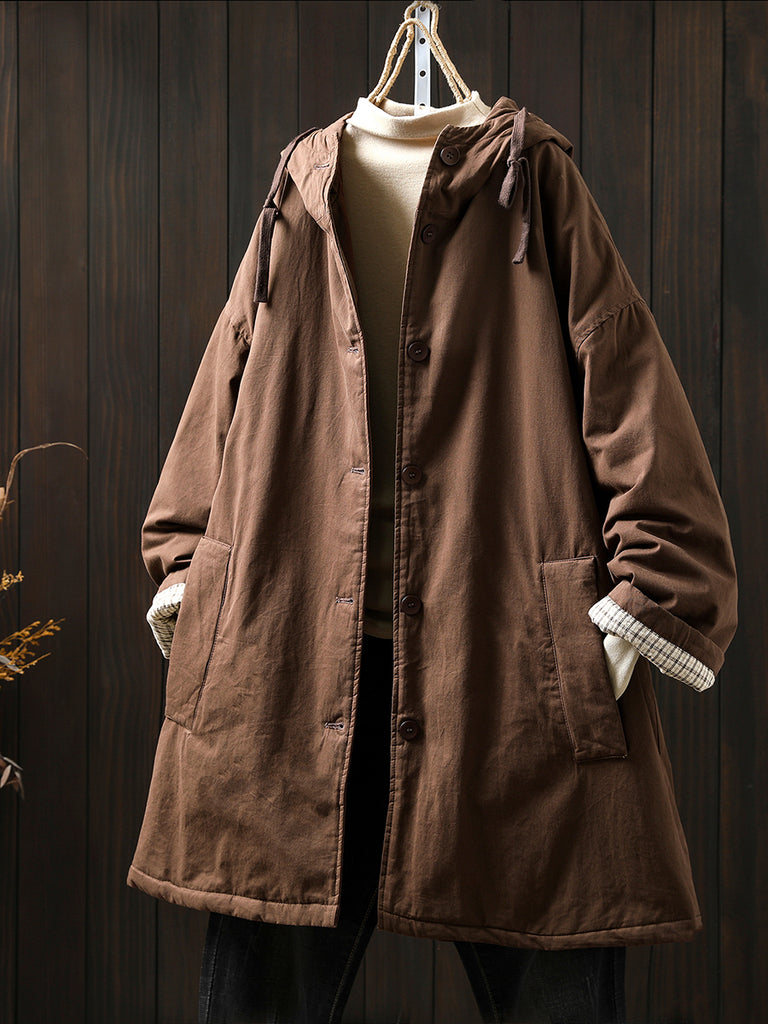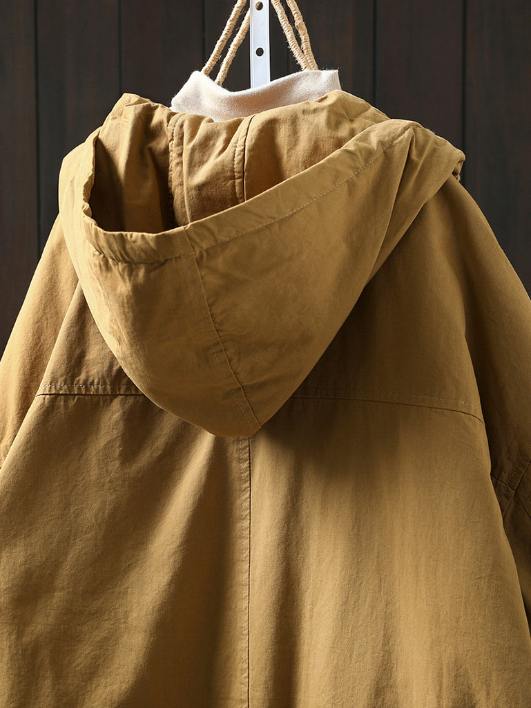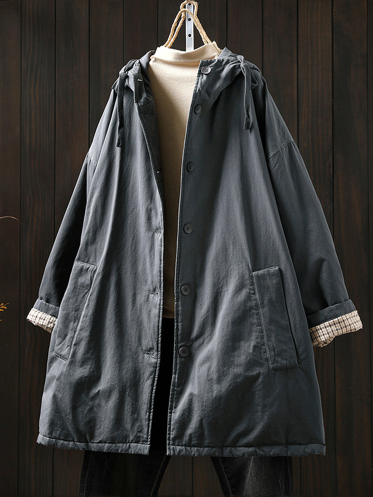 Ovaj kaput ima jednobojni dizajn s kapuljačom na ovratniku. Ima raglan rukave pune duljine s vintage stilom, idealan za jesensku i zimsku sezonu.