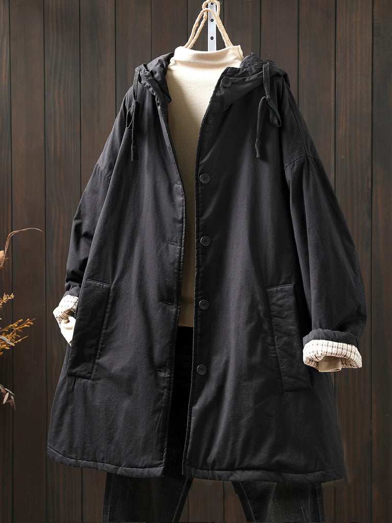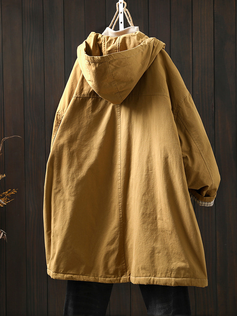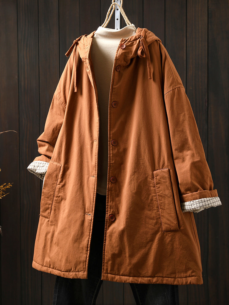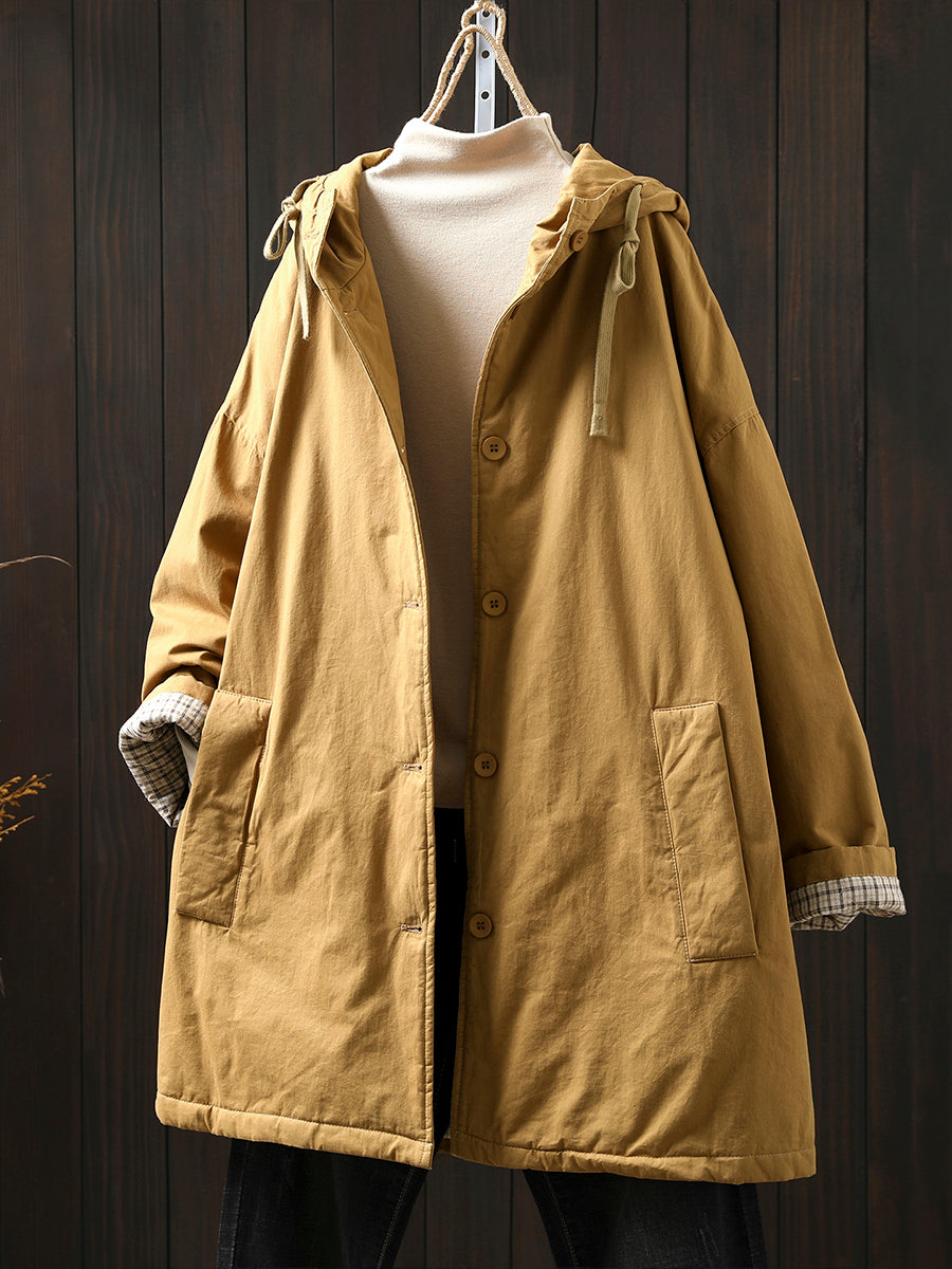 Ovaj kaput ima jednobojni dizajn s kapuljačom na ovratniku. Ima raglan rukave pune duljine s vintage stilom, idealan za jesensku i zimsku sezonu.
