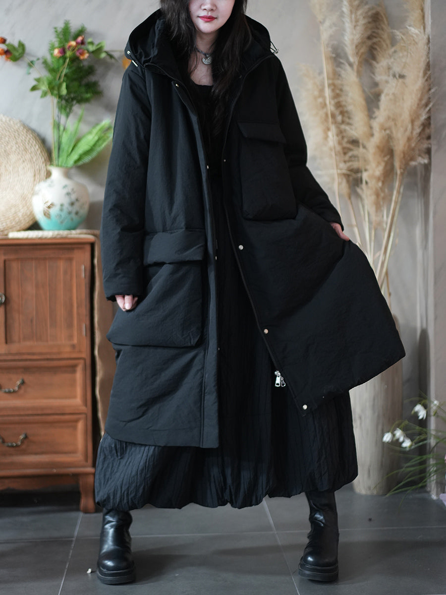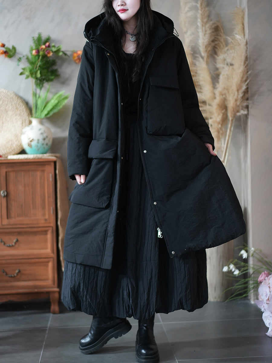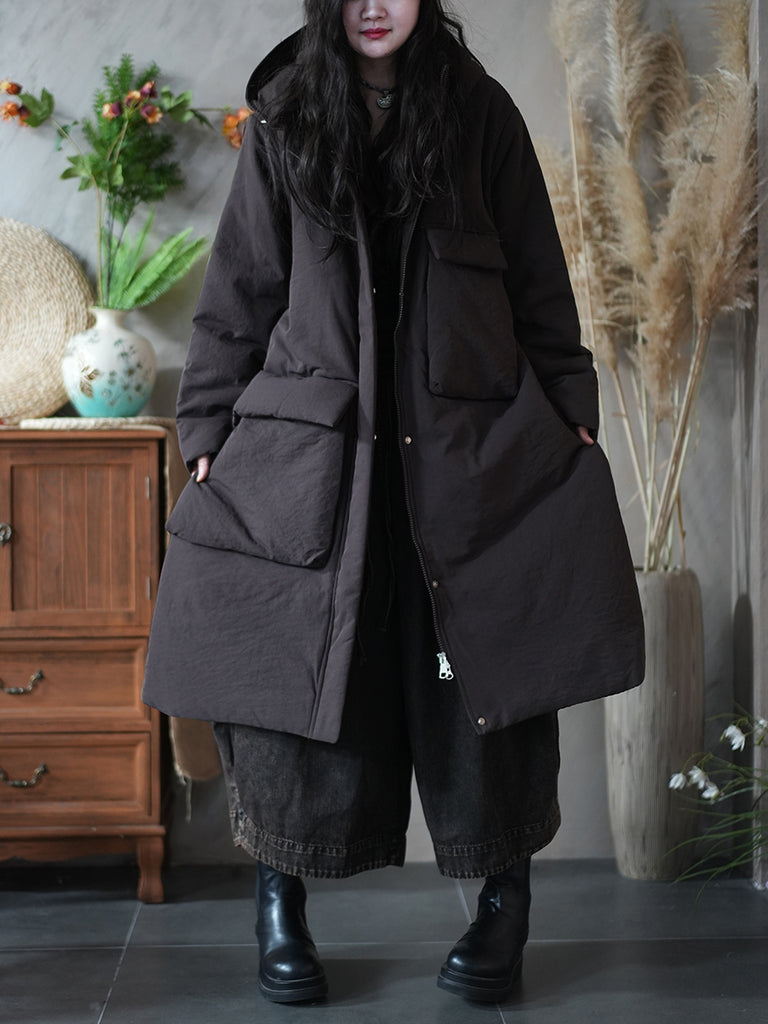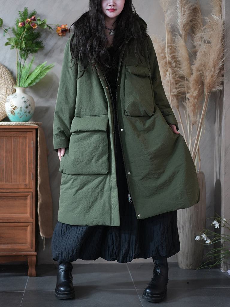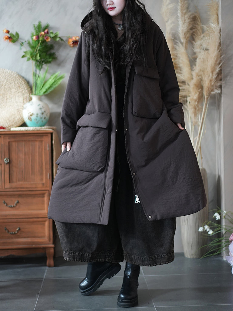 Ženski zimski kaput s kapuljačom i podstavljenim džepovima u čistoj boji