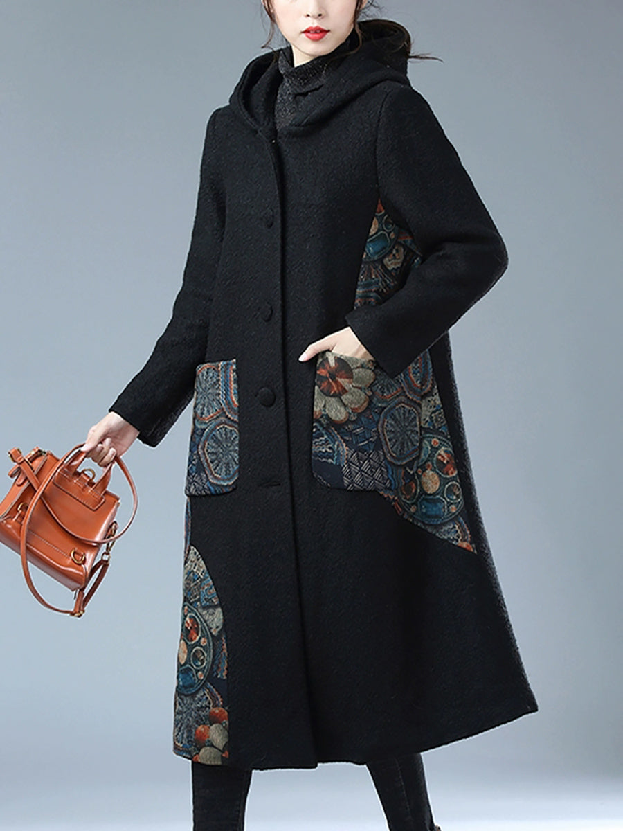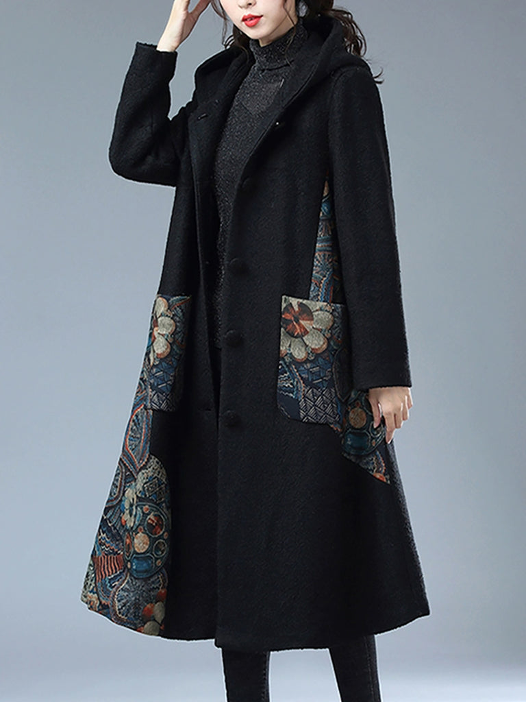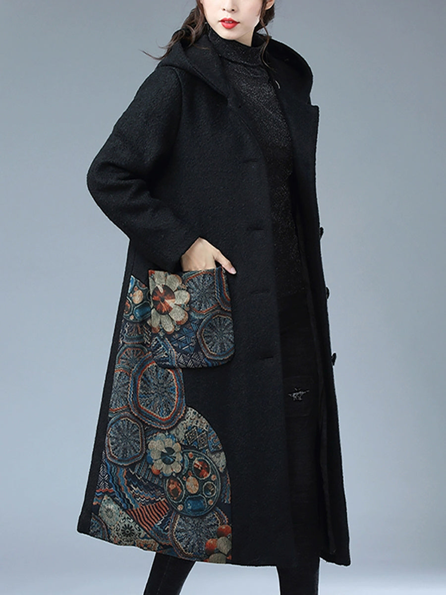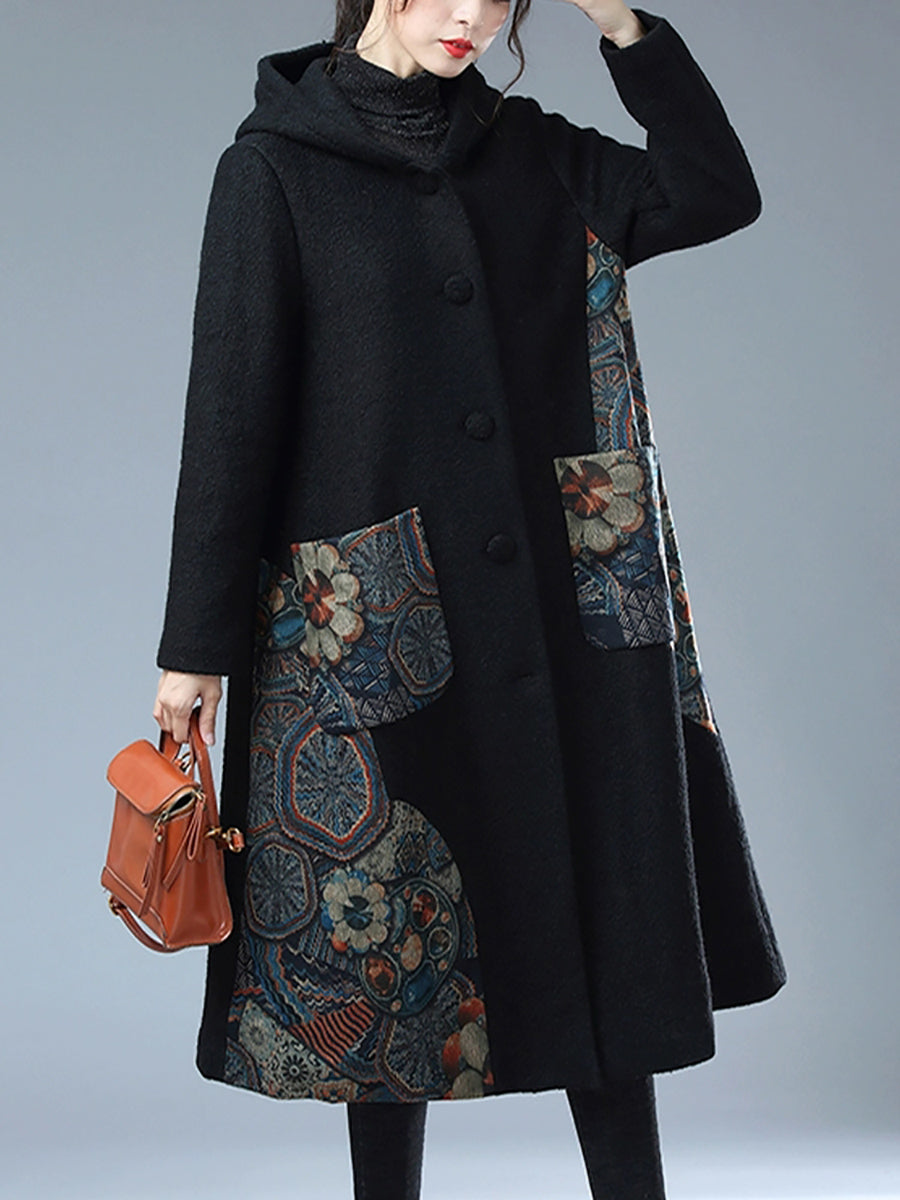 Ženski zimski kaput s kapuljačom i vintage cvjetnim zakrpama