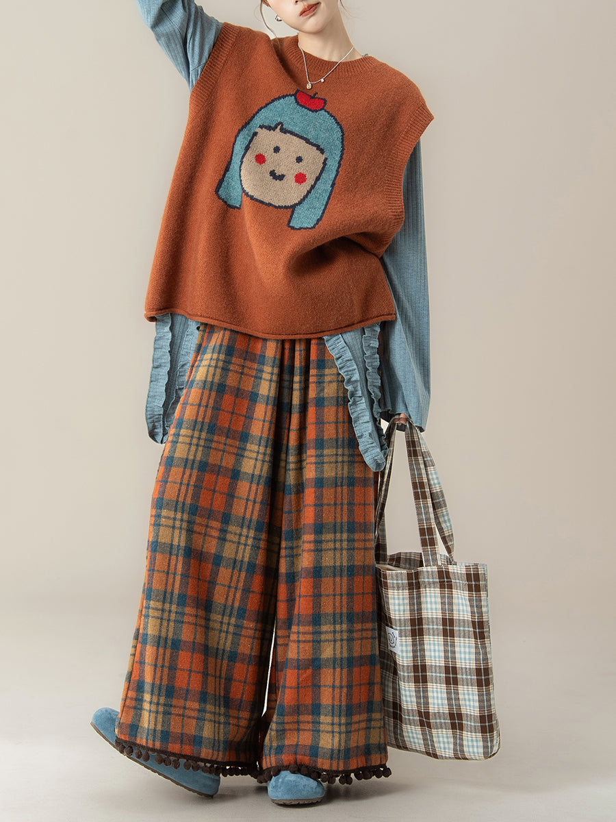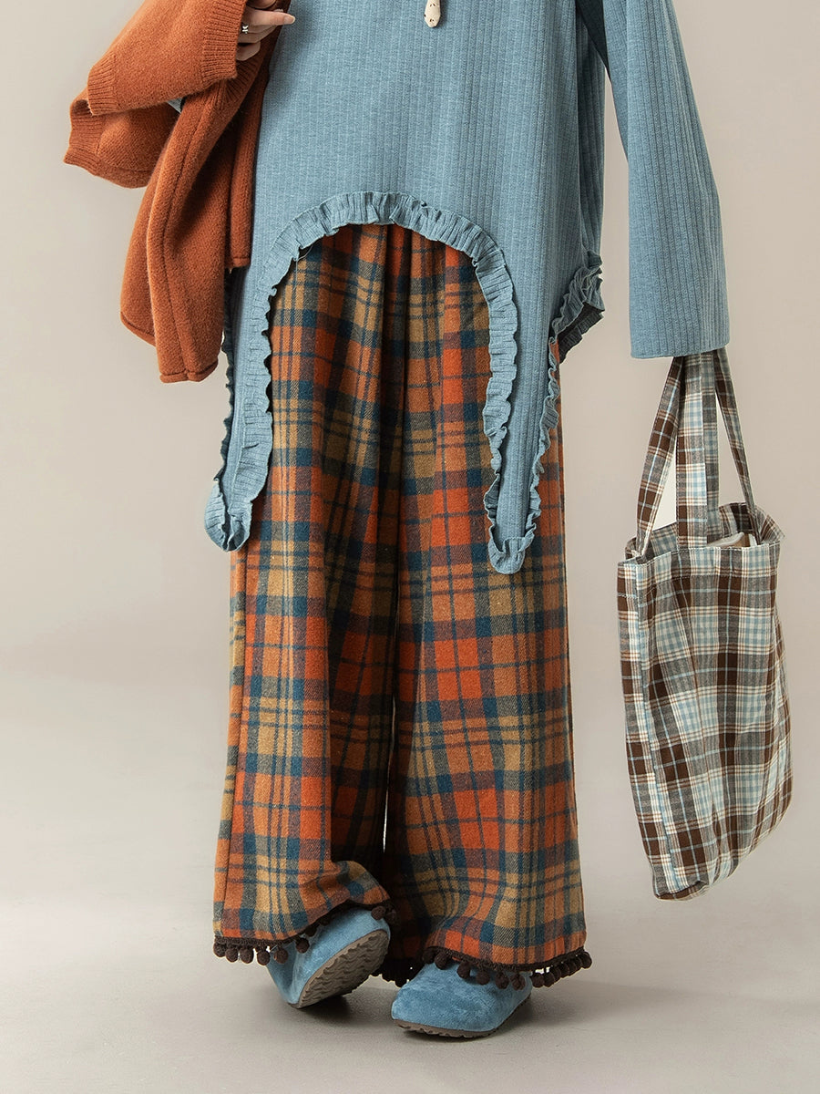 Ženske zimske vintage karirane hlače s resicama i širokim rubom