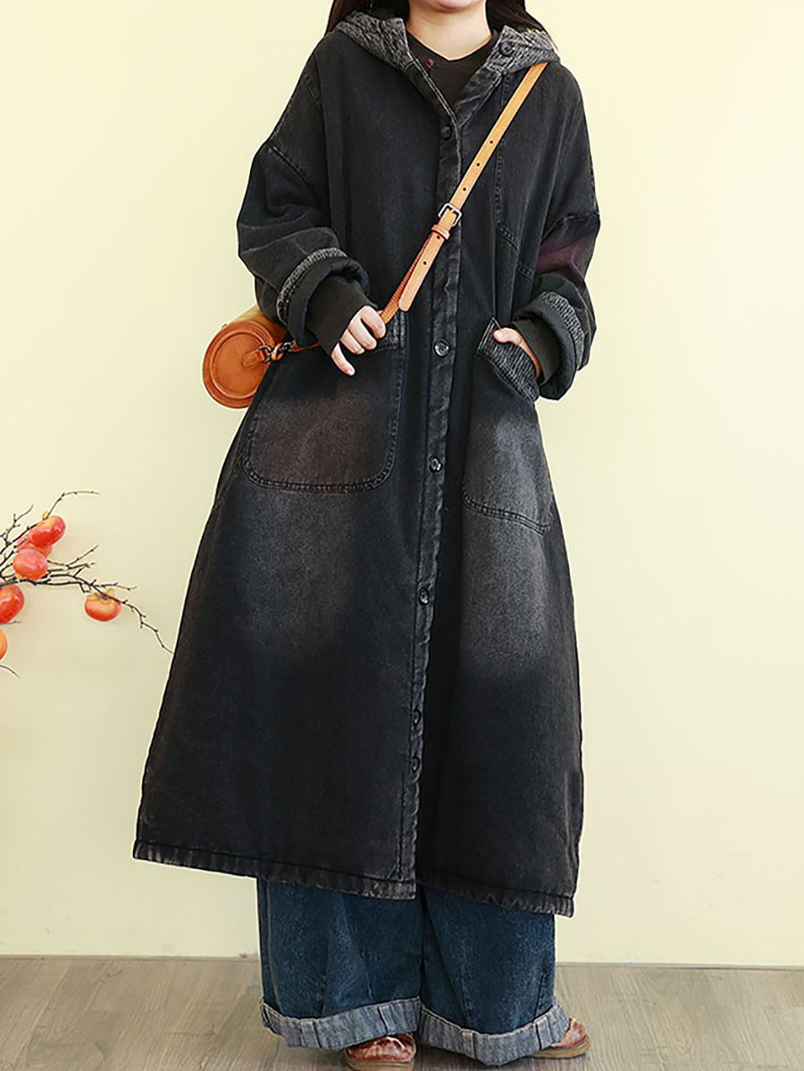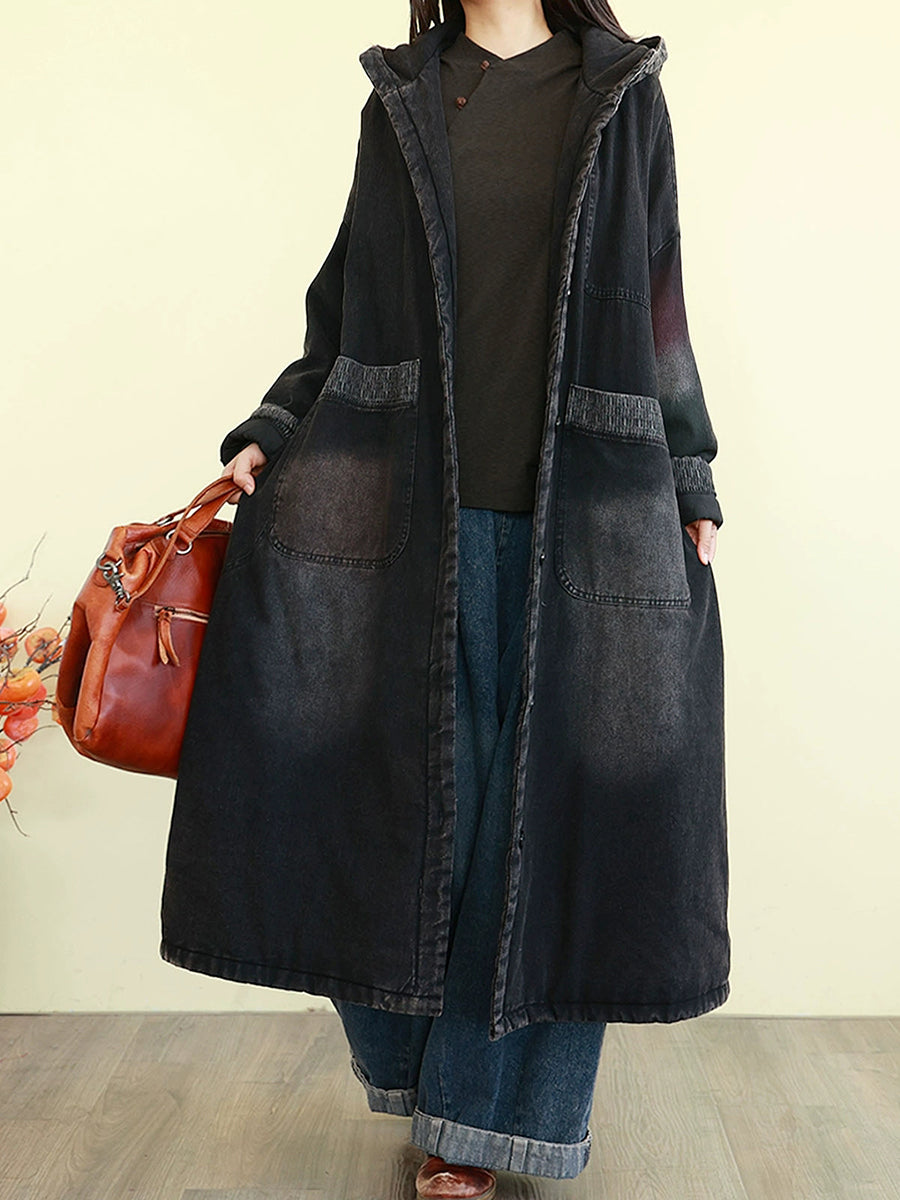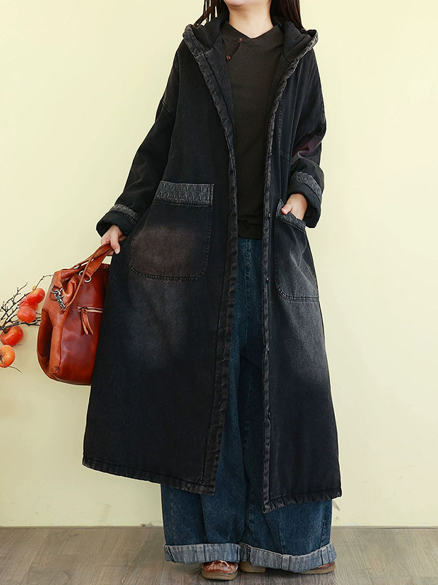 Ženski zimski vintage kaput od opranog trapera s podstavom i kapuljačom