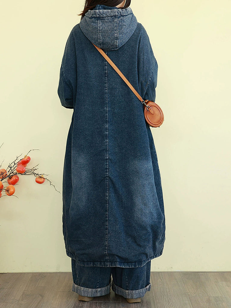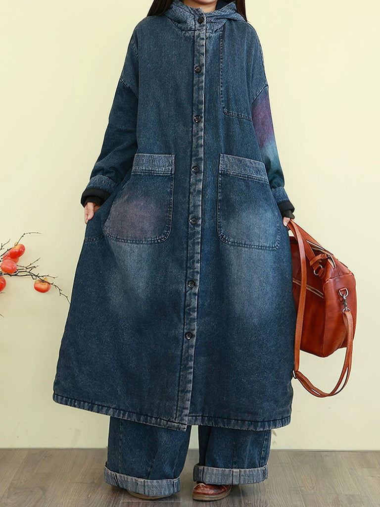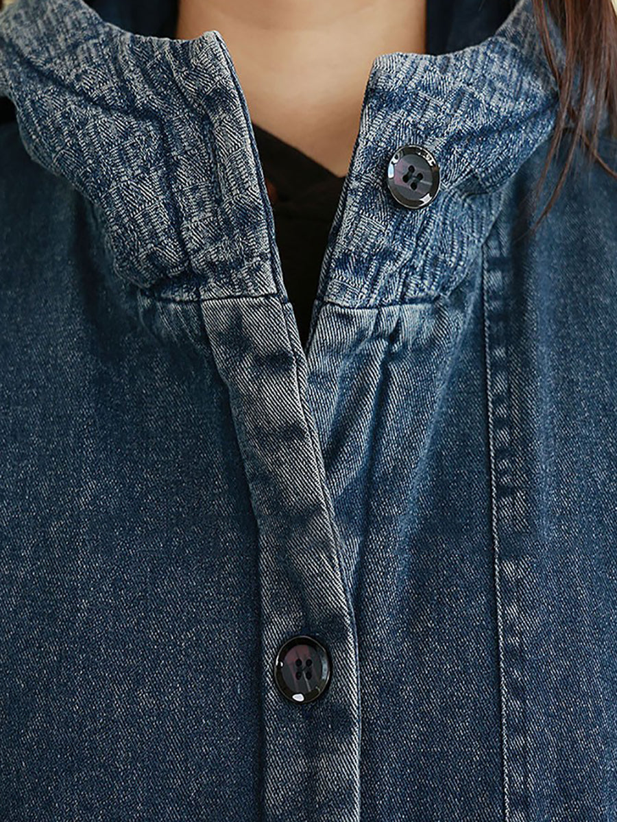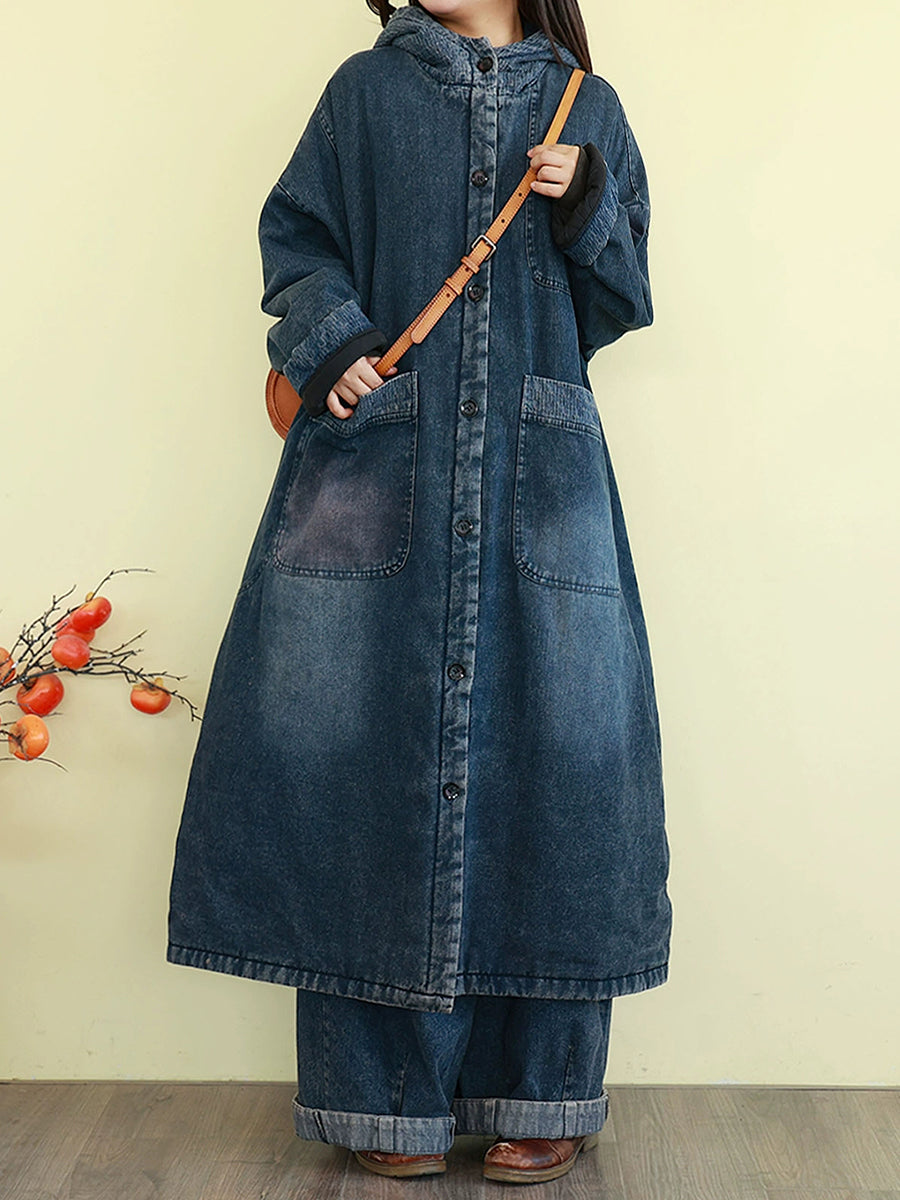 Ženski zimski vintage kaput od opranog trapera s podstavom i kapuljačom